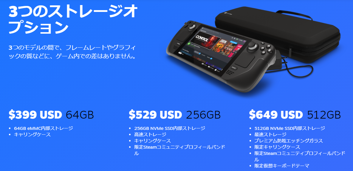 対抗馬として比較的安価なAYANEOは512GBで約10万円(デント)、Steam Deckは同じSSD容量でも649ドル(約7万1000円)とかなり割安です。