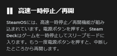 Steam DeckではOSレベルで携帯機としての機能性を盛り込んでくれているようです。スキマ時間にちょこちょこプレイすることが多い身にとってはこれ地味に重要なんですよね…!