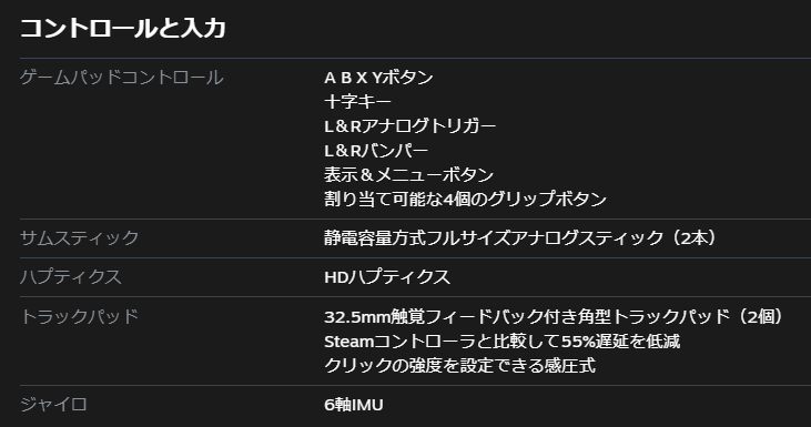 基本的な操作系は一通り揃っているうえに、背面に割り当て自由なボタンが4個、アナログスティックの表面にもタッチ機能があるらしく、どの他機種よりも自由度は高そうです。