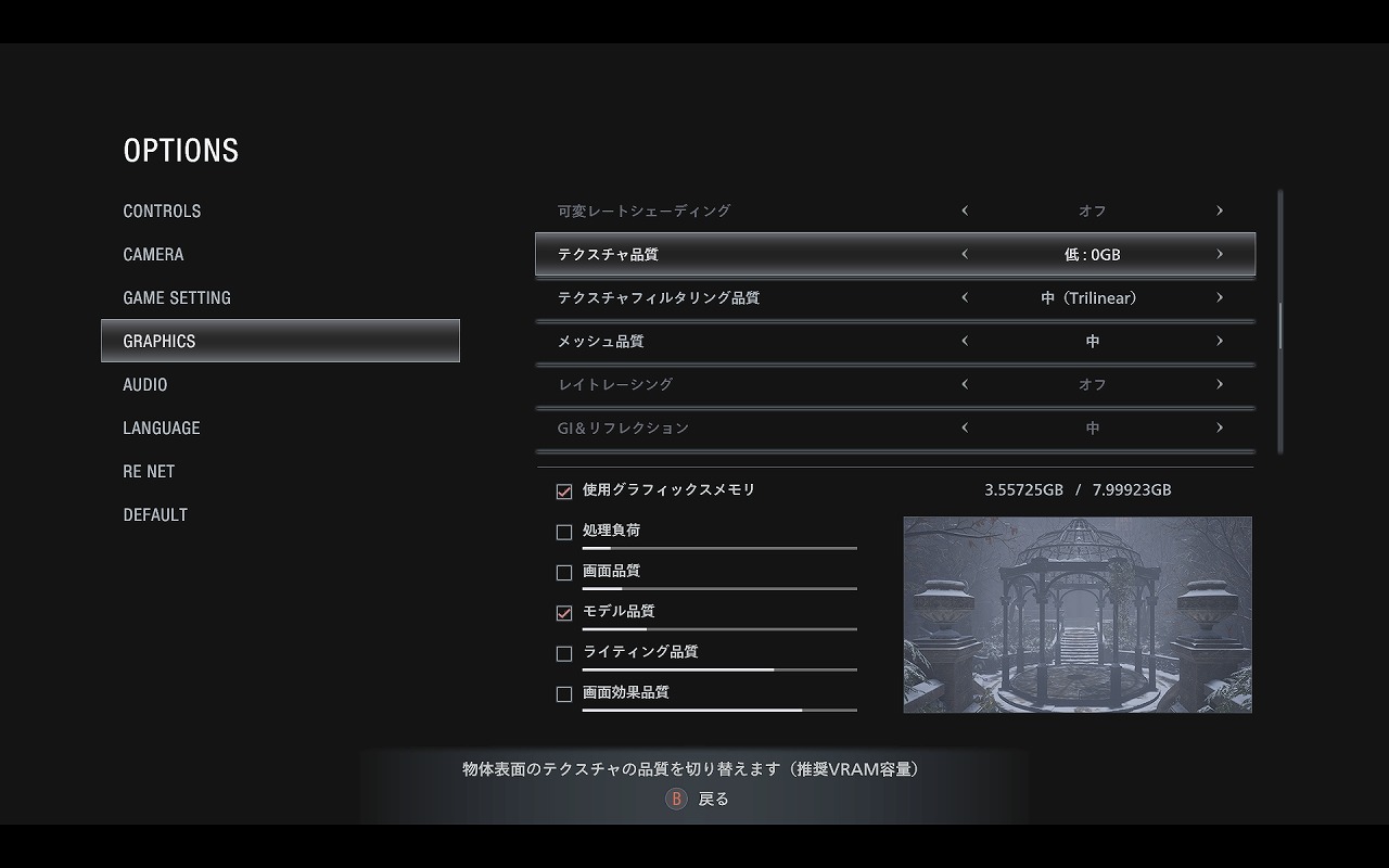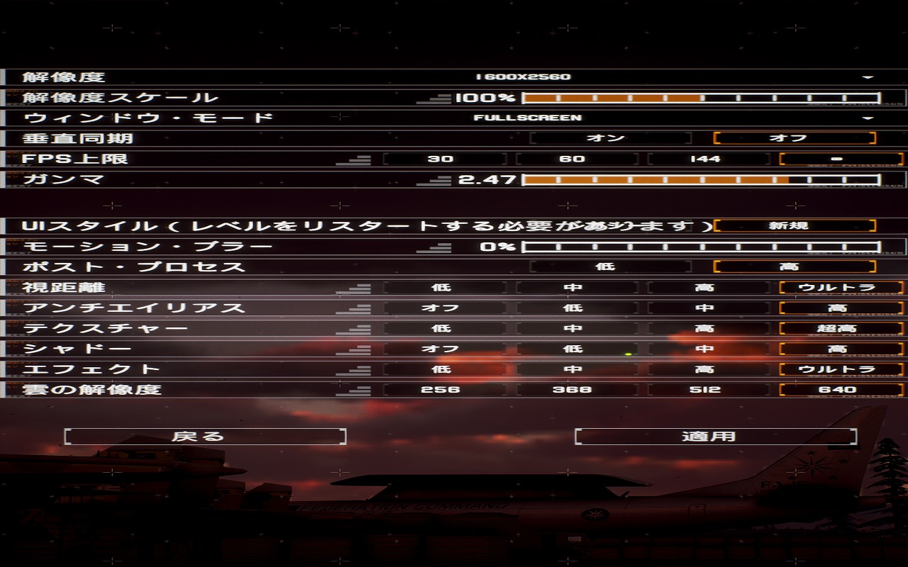 一応、グラフィック設定で「テクスチャ品質」を下げたらだいぶ軽減されて動きも良くなりました。(まだ多少はモタつくけど)