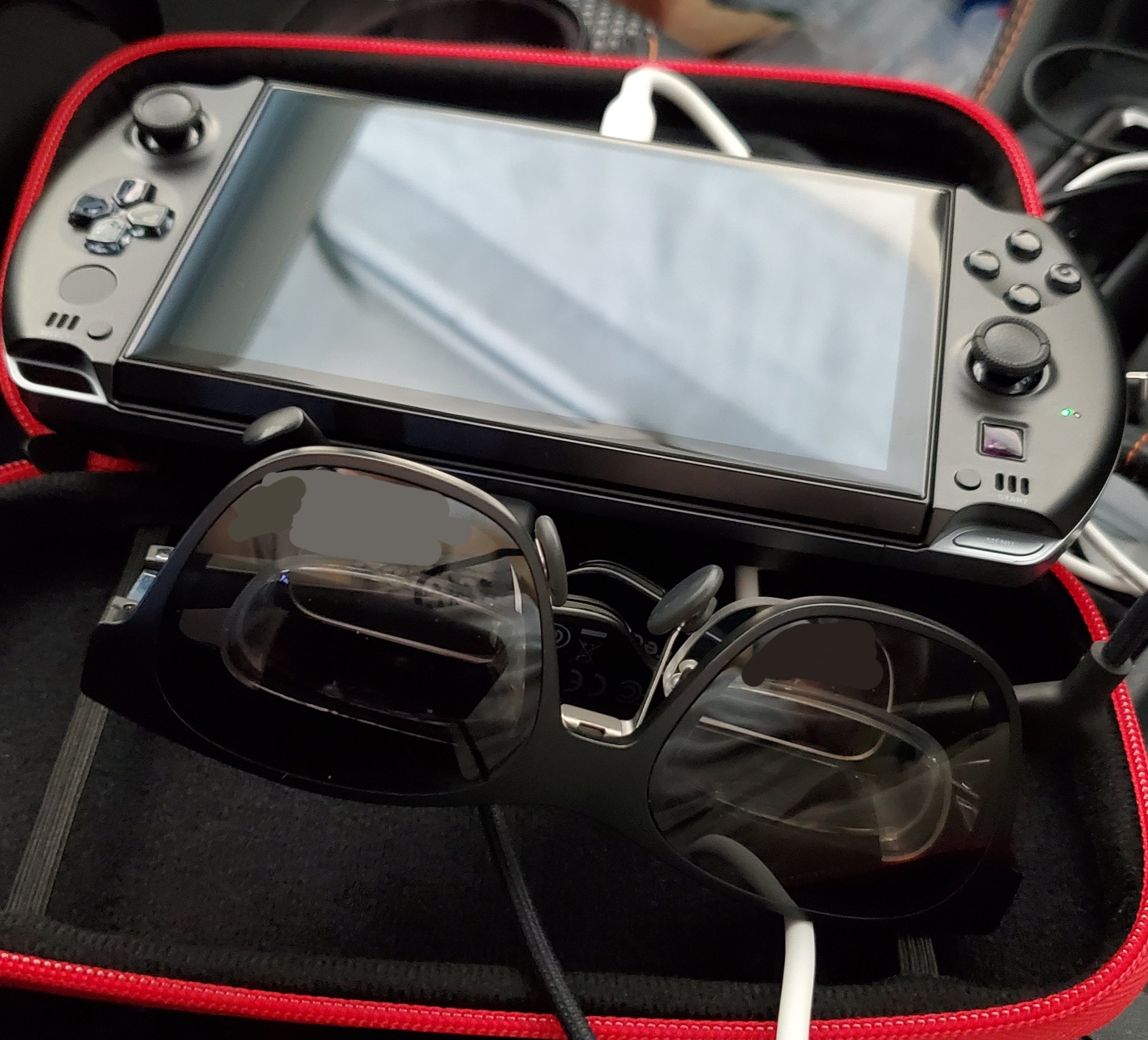 見た目は少し大きめのサングラスなんですが、USB-Cケーブル1本の簡単接続。レンズ部に仕込まれた透過式(反射式?)の高解像度有機ELディスプレイで目の前に大画面が現れます!