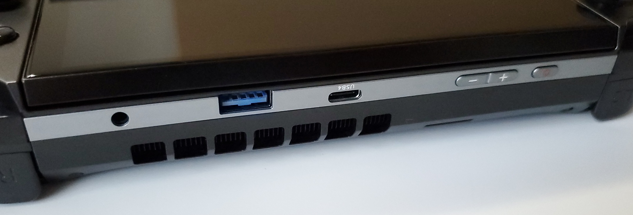上部にはイヤホンジャック、USB-A、USB-C(USB4)、音量+-、電源と排気口。