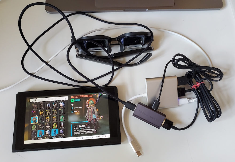 XrealAir(NrealAir)に「給電しながら」SwitchやPSからの映像出力できるHDMI→USB-C変換アダプタようやく見つけた! 前々から探し続けていた、NrealAir用の「給電しながら」使えるHDMI→USB-C変換アダプタを某掲示板で見かけて買ってみました。 買ったのはコイツです。300円引きクーポンで約4700円でした。 HDMI to USB C Type-C 変換アダプタ HD HDMI 4K@60Hz 高解像度モニター映像 AR スマート グラス HDMI 変換アダプター 今使っているNreal純正品のNrealAdapterも良いんですけど、何故か内蔵バッテリーのみでしか使用できず、約3時間という制限があるんですよね…。 普段はそんなに長時間プレイしなくて良いので支障ないんですけど、たまに出張とかでフリーダムになったりすると3時間以上プレイできちゃうこともあったりしてたので、「そんなのあるといいなー」と探してはいたんですよね。 前に持ってたWacomLinkPlusも、Nrealのアップデートで画像の見切れる仕様が改善されたそうなんですが、既に販売終了していてプレ値になっちゃって手が出なかったのです…(売らなければよかった…orz)。 ということで、現物はこんな感じです。 バッテリー非搭載なので、サイズはNrealAdapterよりだいぶ小さくて軽いです。 インターフェースは、HDMIポート×1、USB-C×2となっていて、長い方の側面にあるUSB-Cが給電用ですね。 Switchから出力する場合は、本体付属のドックがある場合はそこからHDMIで直接この変換アダプタに繋げばいいんですが、オレは本体のみのジャンク品Switchなので、写真のようなドック代わりのアダプタ(銀色のやつ)を使っています。 バカでかい純正ドックよりも相当小さいので、出張先でテレビに出力してプレイするのに良いです。PSとかの場合は、この銀色のアダプタ(アダプタだらけでようわからんねw)は必要なく、PS本体からHDMIケーブルを繋げばOKです。 Vikisda USB Type c HDMI アダプター 3in1 Type-C to HDMI 変換アダプター ちなみに、これ(銀色の方)の良いとこは、USB-A端子もついてるので、今回新たに買ったHDMI→USB-Cアダプタへの給電にも使えることですね! わざわざ充電器から配線引っ張ってくる必要がないので配線もミニマムにできます。 ということで、無事ミニマム構成でティアキンをNrealAirに出力することができました。 【ここで注意点!!】※大事なとこ! 映像は出力されますが、今のところ、NrealAirからの音声出力ができていません。オレはワイヤレスイヤホンで直接音声飛ばしてるので支障ないですが、ご注意ください。 もうティアキンはクリアしちゃっていまGPDWIN4モードに入ってしまったので、しばらく出番はなさそうだけど、NrealAdapterの充電手間もなくなるし、時間制限もないので、より理想的な環境になってまいりました! 現場からは以上です! PR
