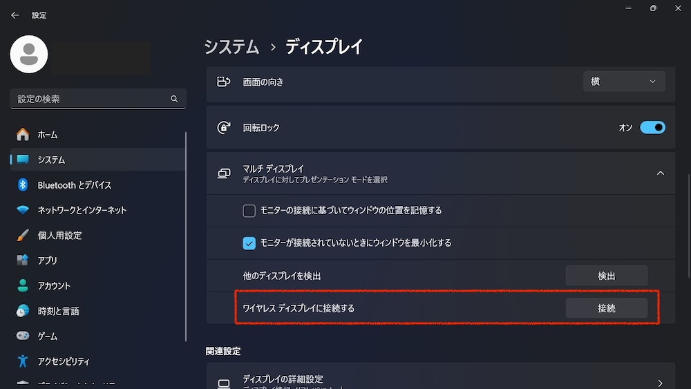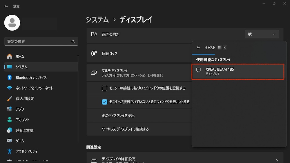 Windows機とBeamを同じWiFiネットワークに接続した状態で、ディスプレイ設定からワイヤレスディスプレイとして接続します。